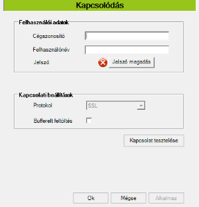 Ahhoz, hogy a beküldés megtörténhessen, bejelentkezés szükséges. Erre egy piros sáv is figyelmezteti a felhasználót a kezdőképernyőn, ami elnavigál a megfelelő beállítási ablakra. Itt meg kell adni a felhasználói fiók nevét, a felhasználónevet és a felhasználó jelszavát. Ha azadok beírásra kerültek, akkor lehetőség van a kapcsolatot tesztelni. Ha a teszt sikeres volt, akkor az OK gomb megnyomása után a kezdőképernyőn a piros sáv helyett egy zöld sávnak kell megjelennie, ami arra utal, hogy a szoftver már képes megrendeléseket beküldeni a beállított felhasználó nevében.
